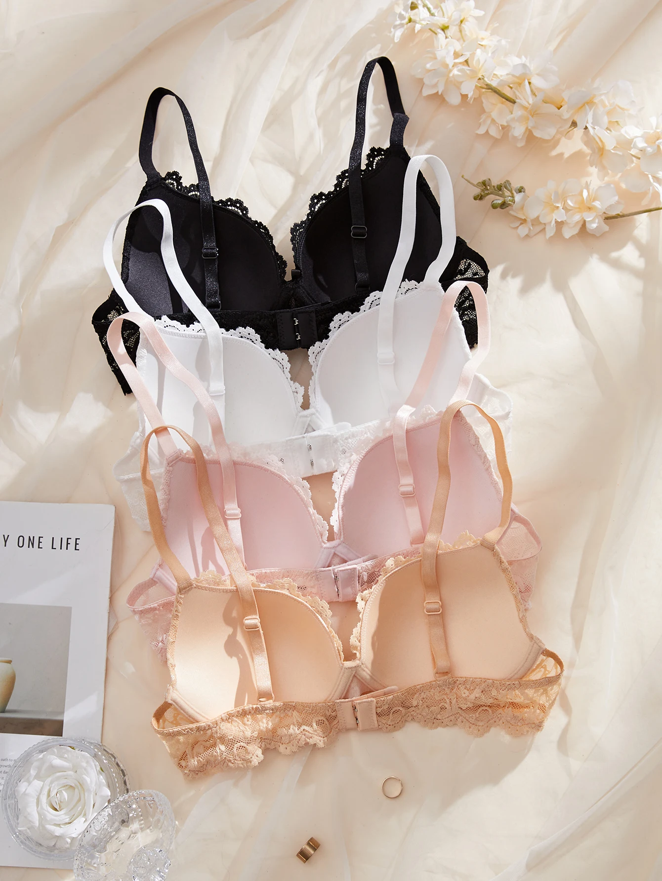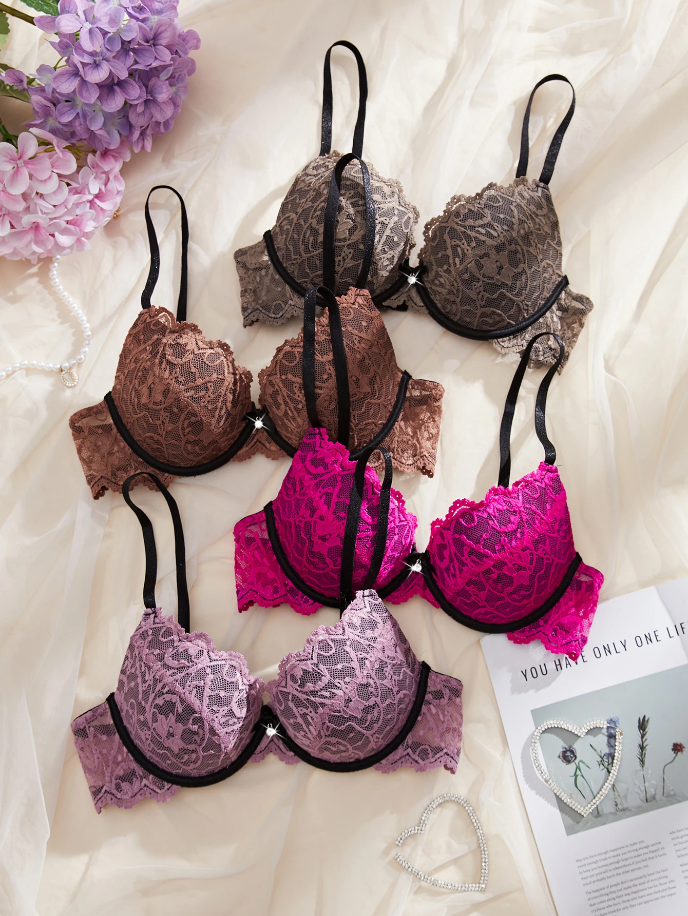 4Pcs Daily Lace Trim Women's Underwear Set Rhinestone Push up Underwire Bra Airy & Stylish Women Lace Lingerie Set