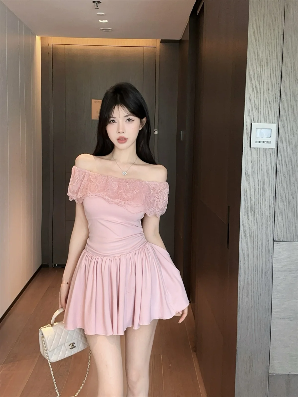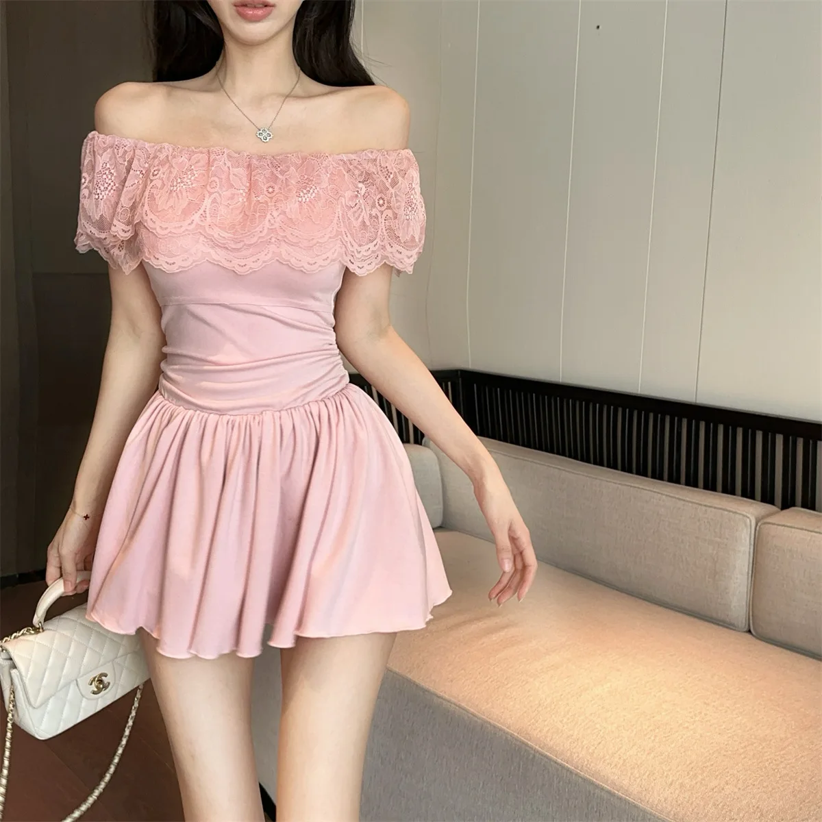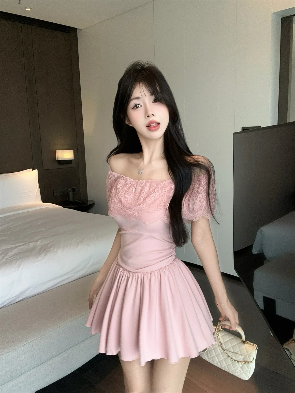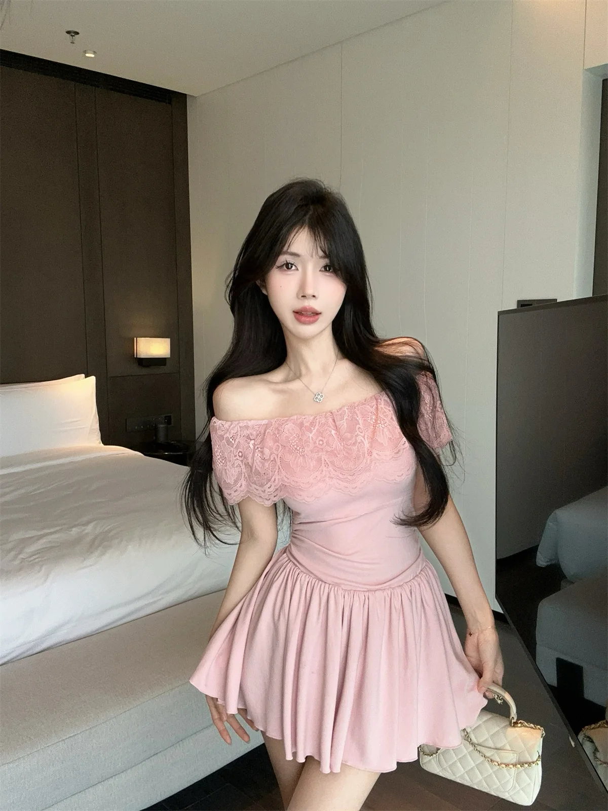D5656Europe and America2026Cross-border foreign trade French sweet style off-shoulder lace patchwork waist-cinching dress