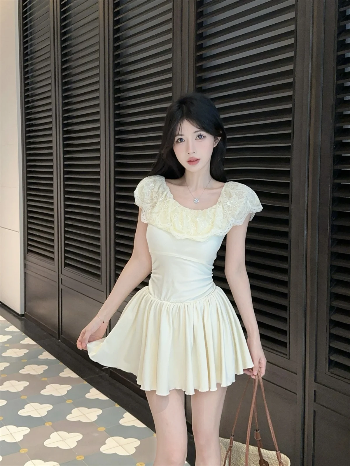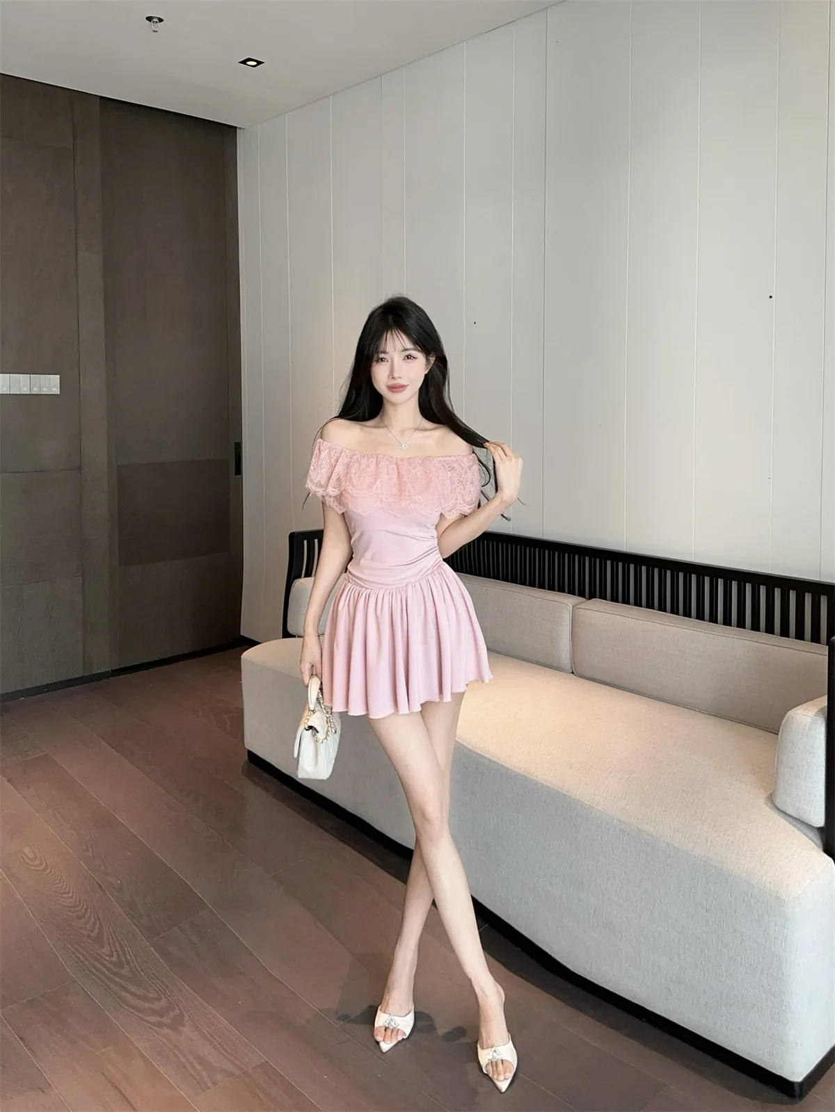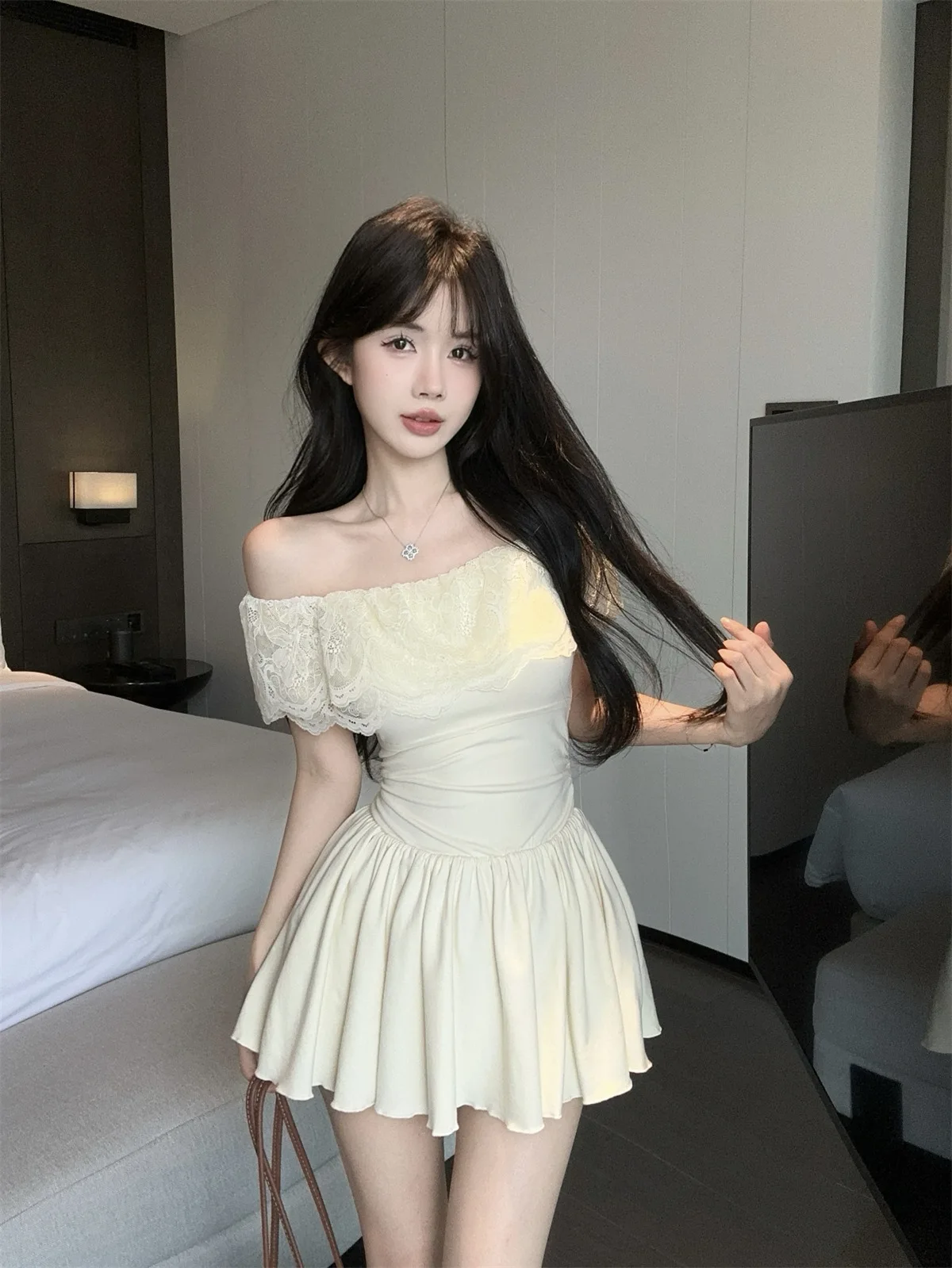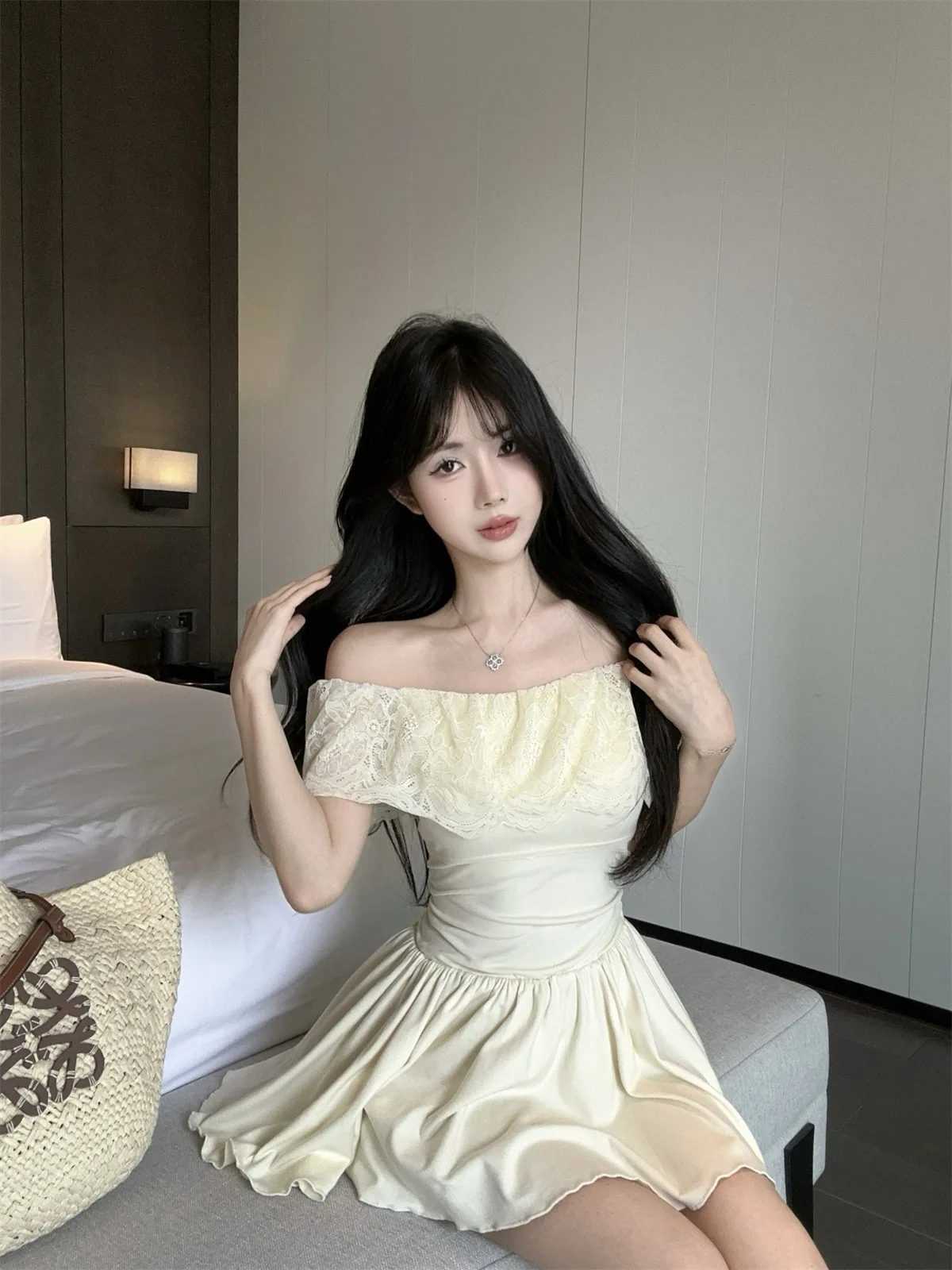 D5656Europe and America2026Cross-border foreign trade French sweet style off-shoulder lace patchwork waist-cinching dress