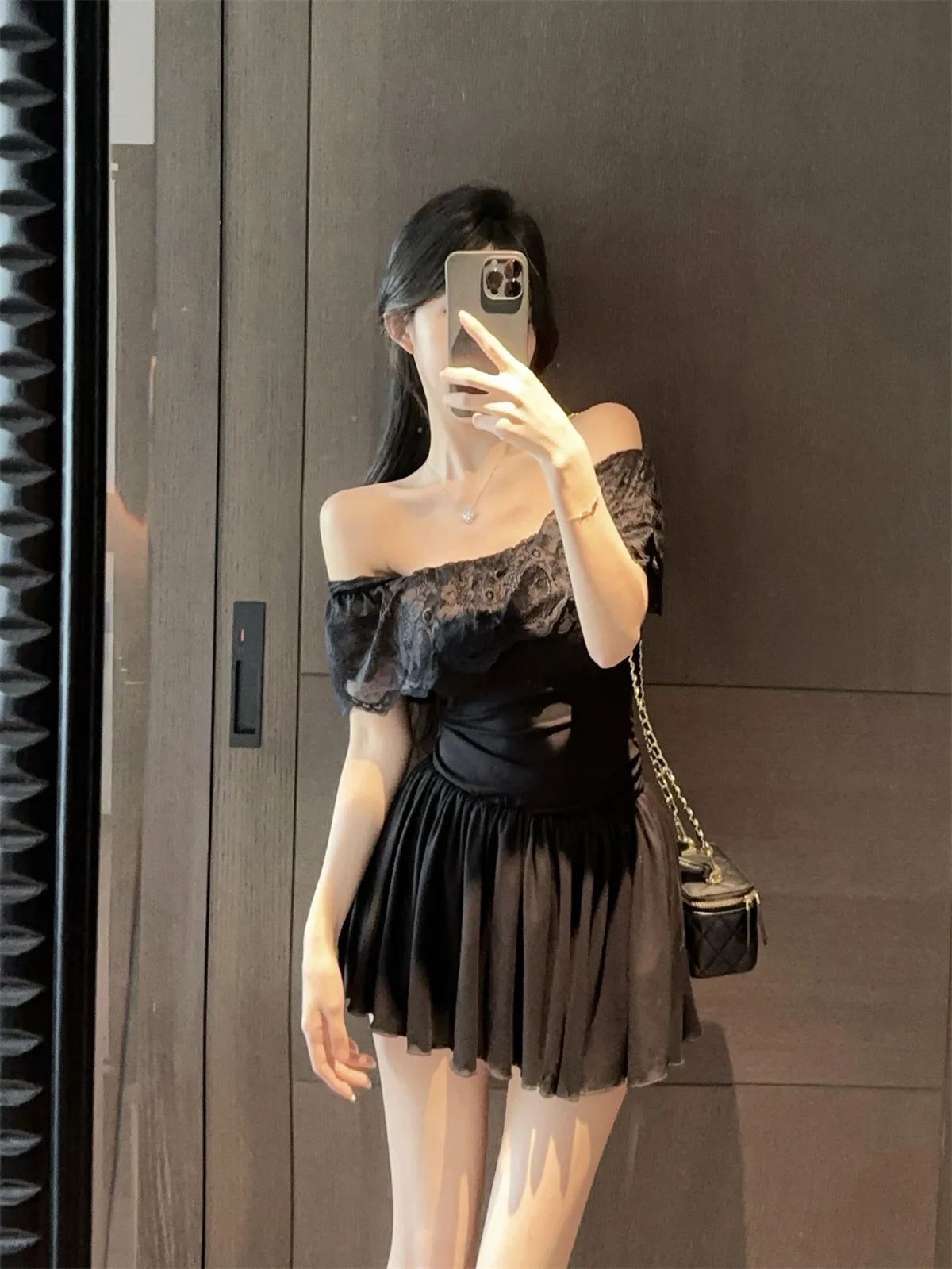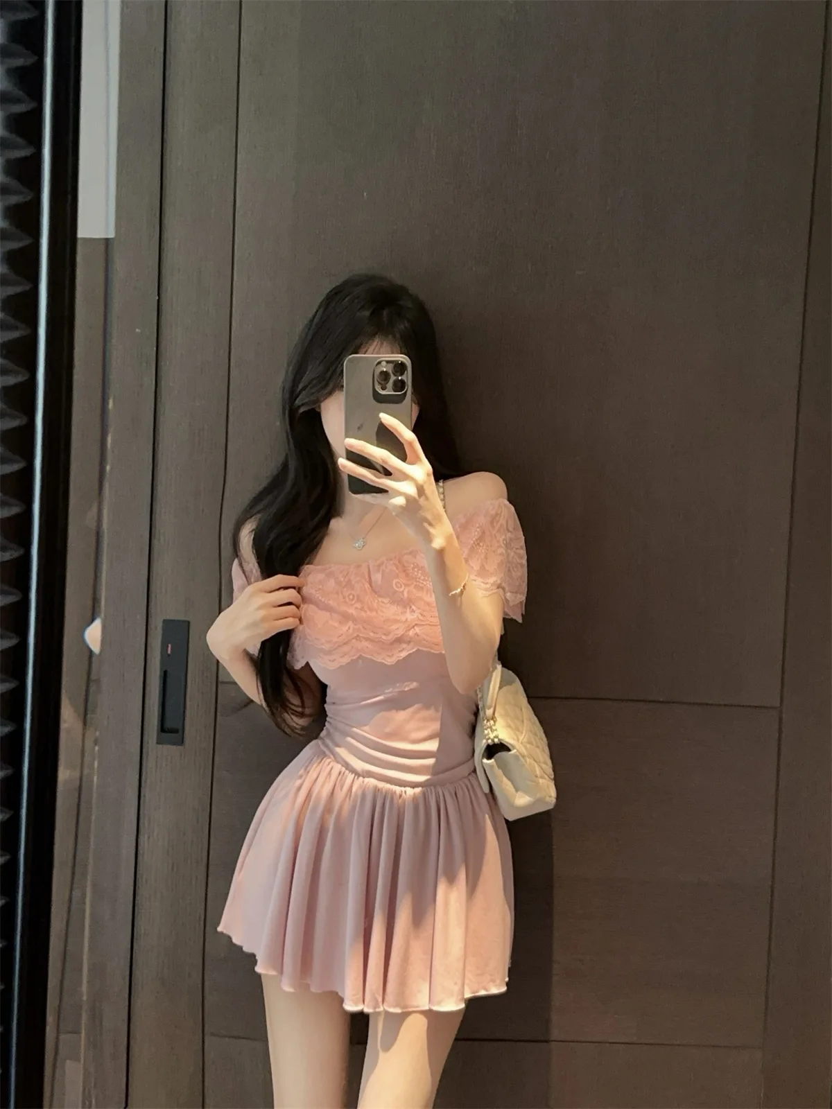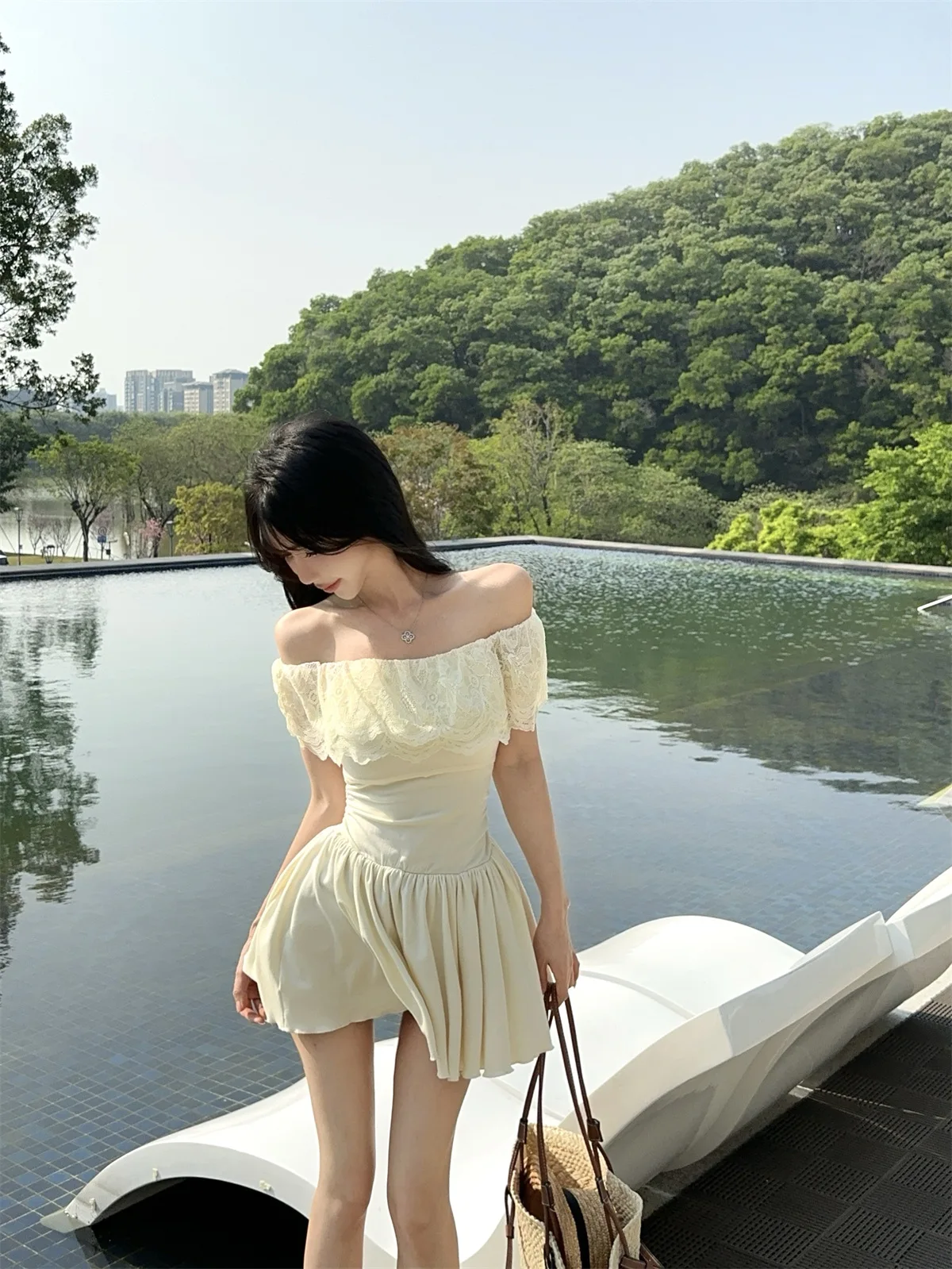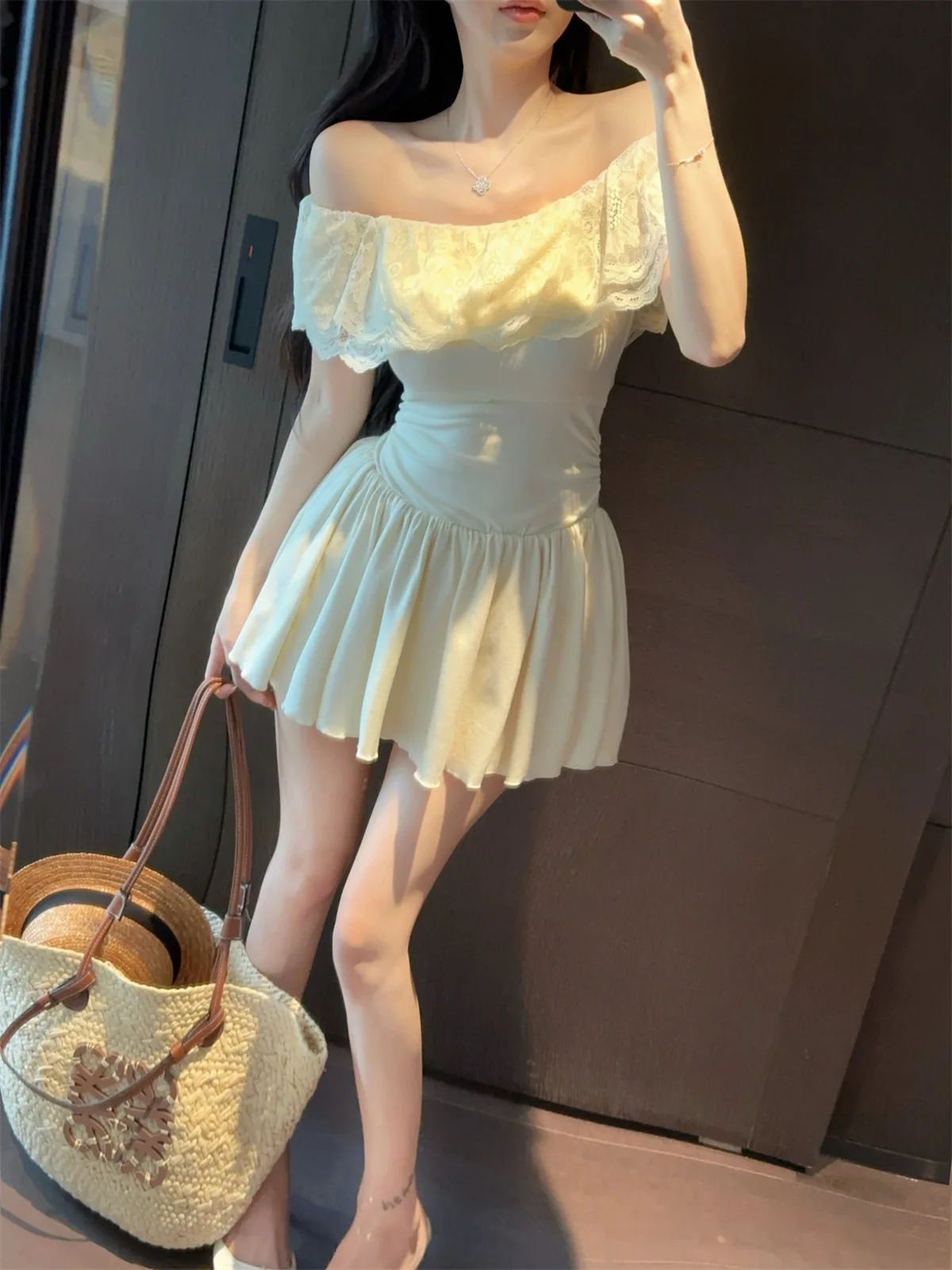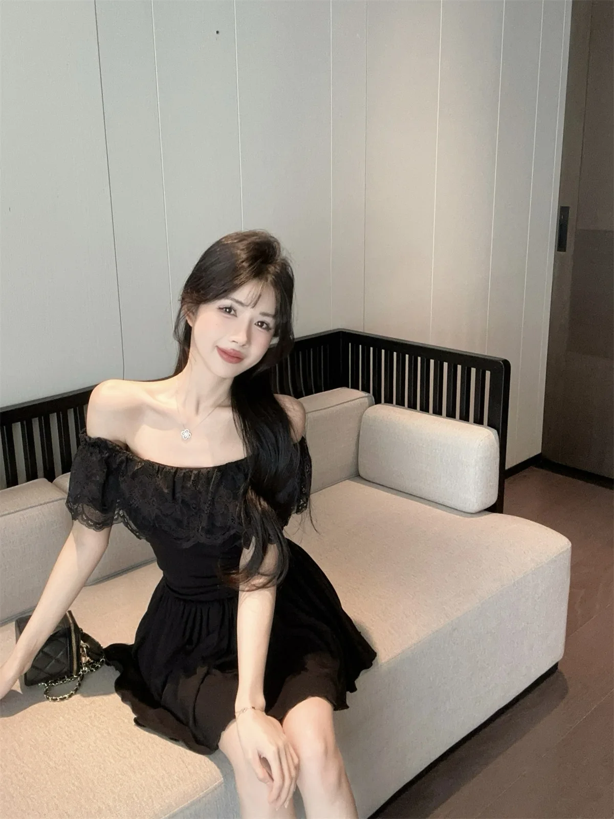D5656Europe and America2026Cross-border foreign trade French sweet style off-shoulder lace patchwork waist-cinching dress