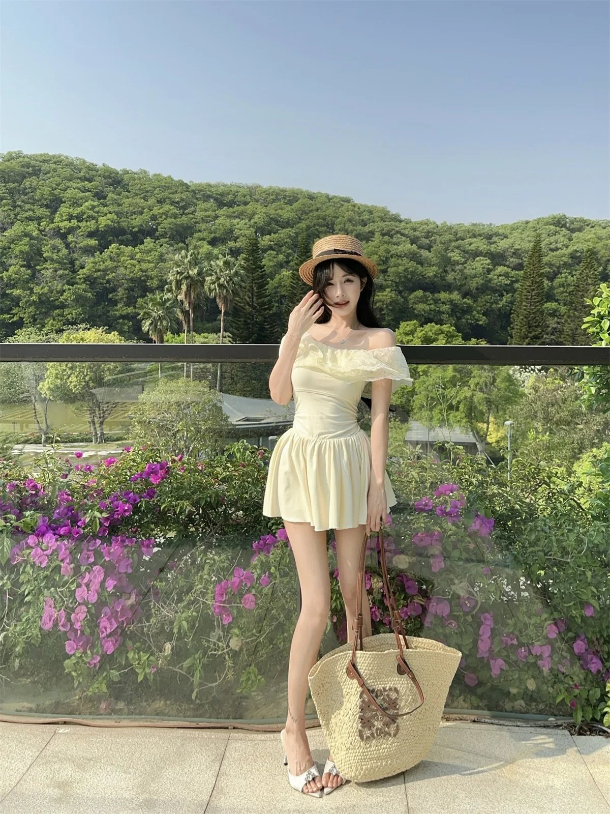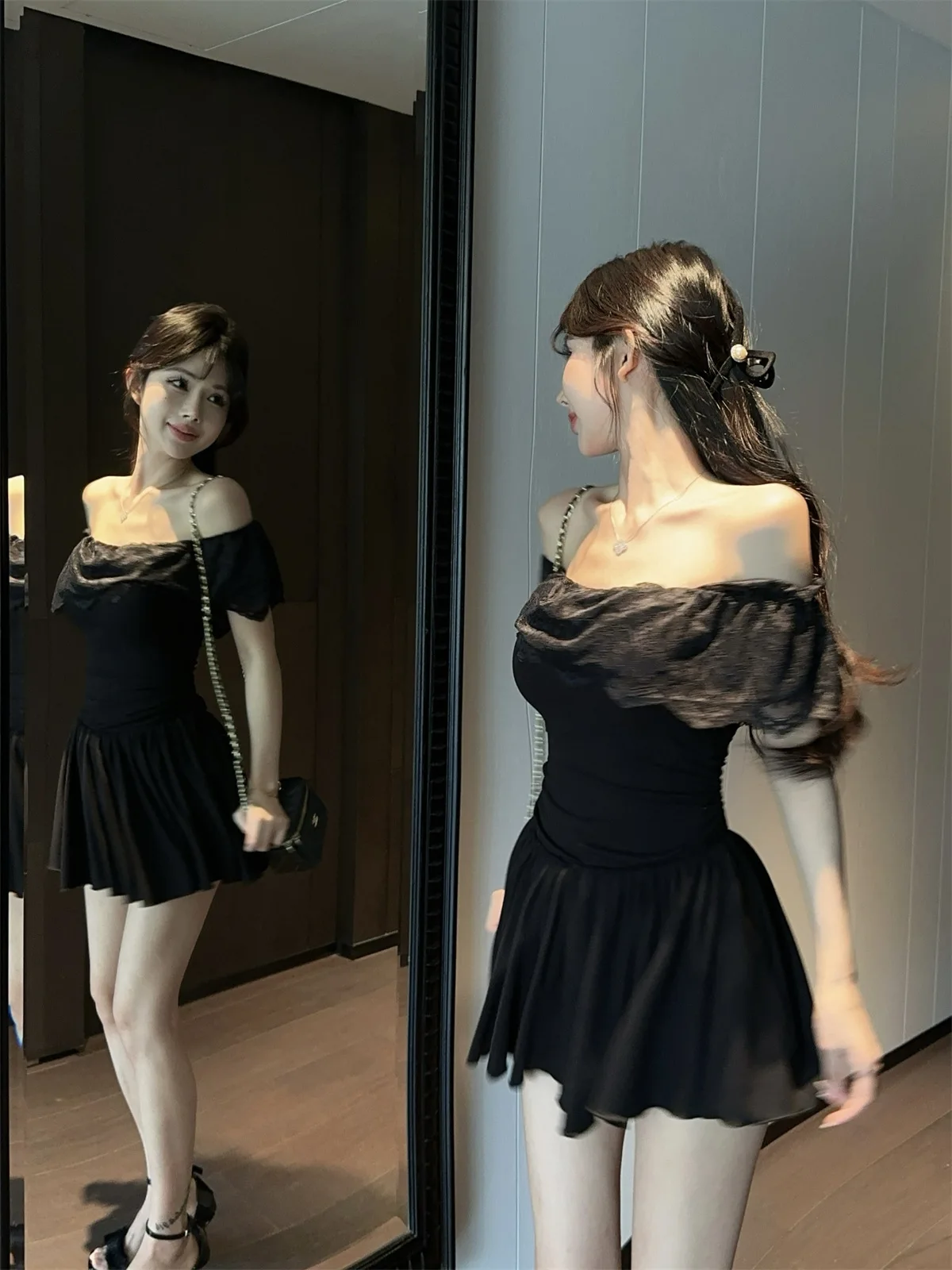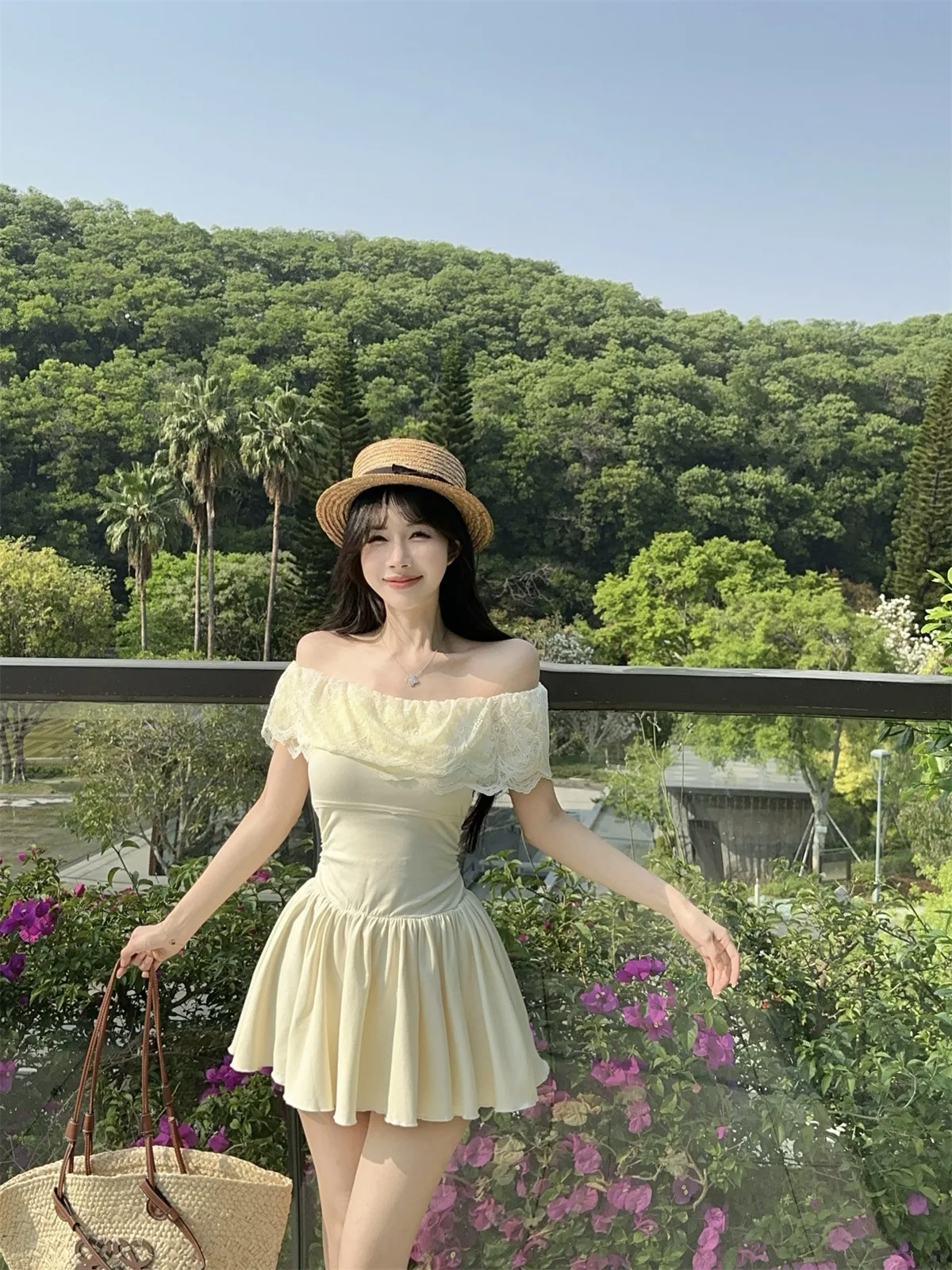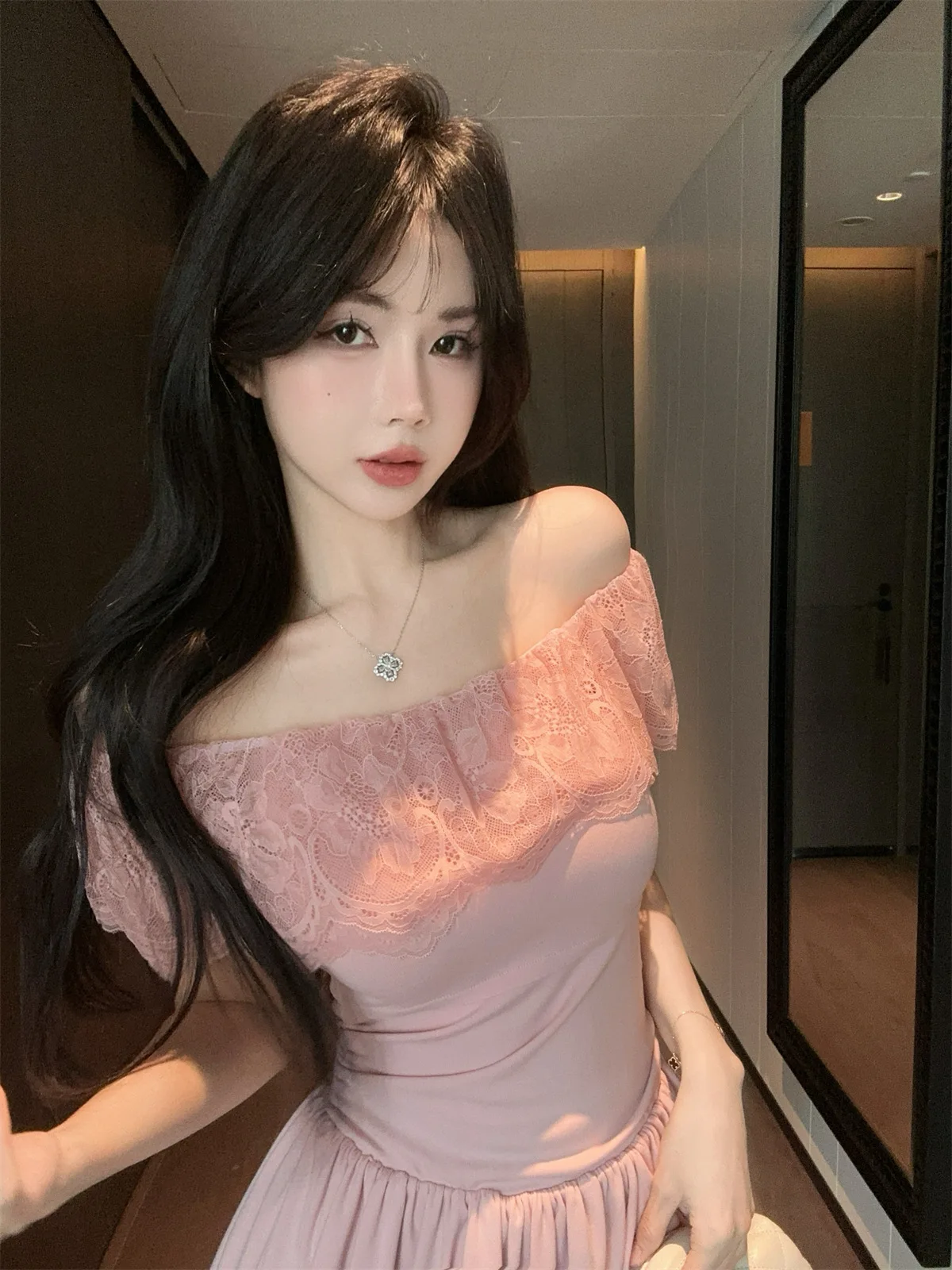 D5656Europe and America2026Cross-border foreign trade French sweet style off-shoulder lace patchwork waist-cinching dress