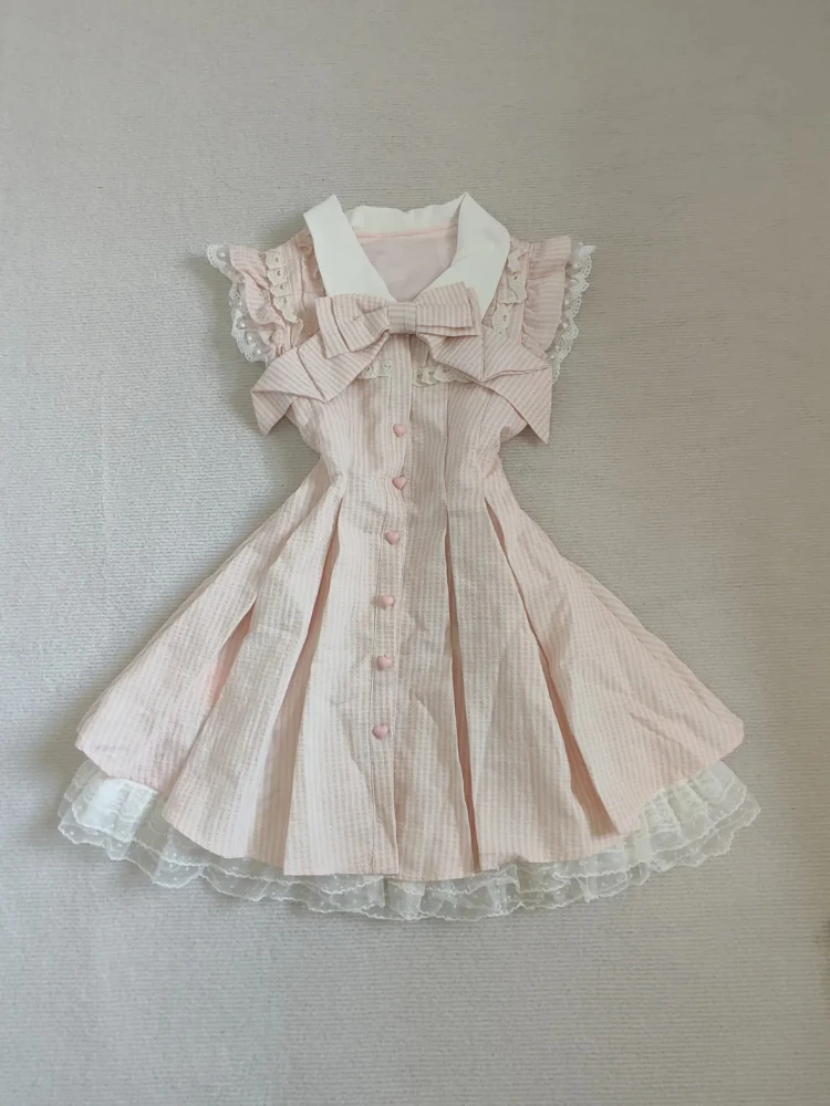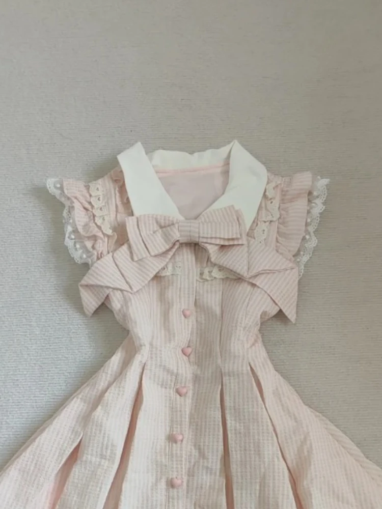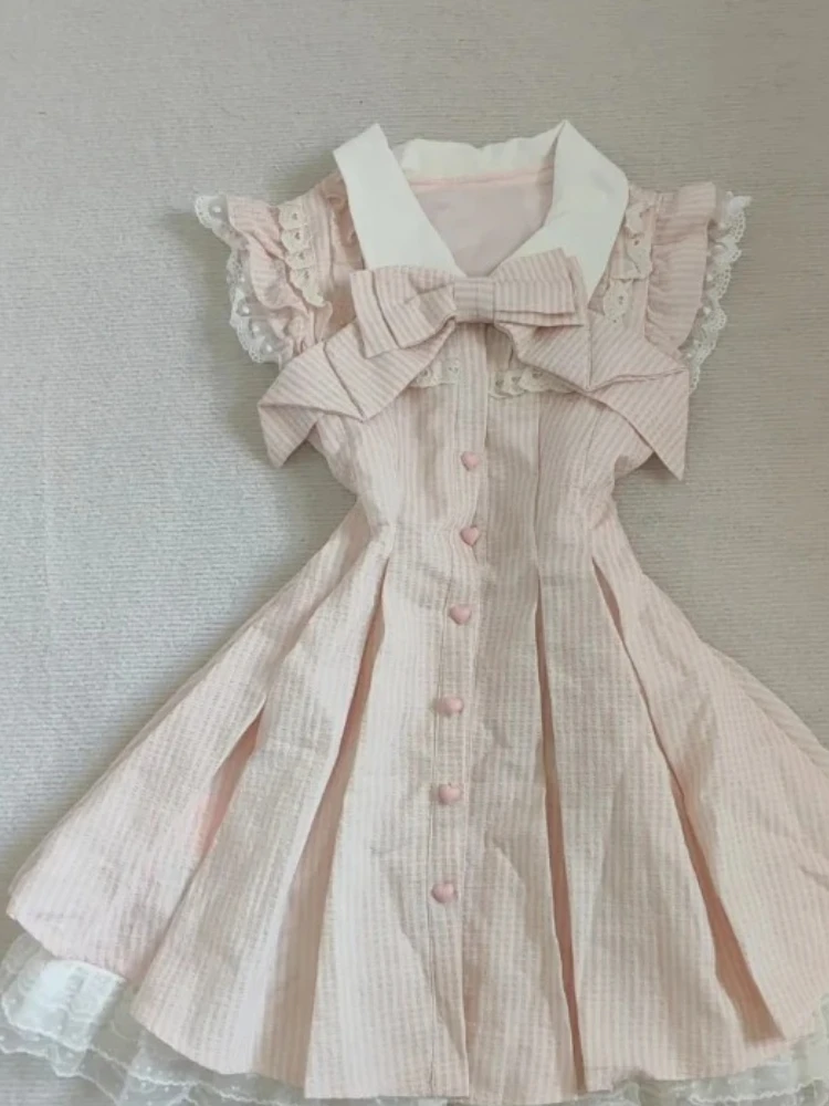 Japanese Sweet Kawaii Striped Elegant Women Dress Fashion Cute Bow Y2k Princess Dress Harajuku Chic Lace Korean Popular Clothes